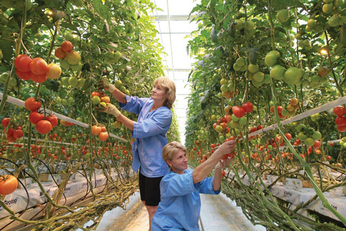В наших теплицах растут томаты всех типов в широком ассортименте, а также огурцы и листовой салат. У нас круглогодичный производственный цикл, поэтому мы гарантируем стабильную занятость в течение всего календарного года.